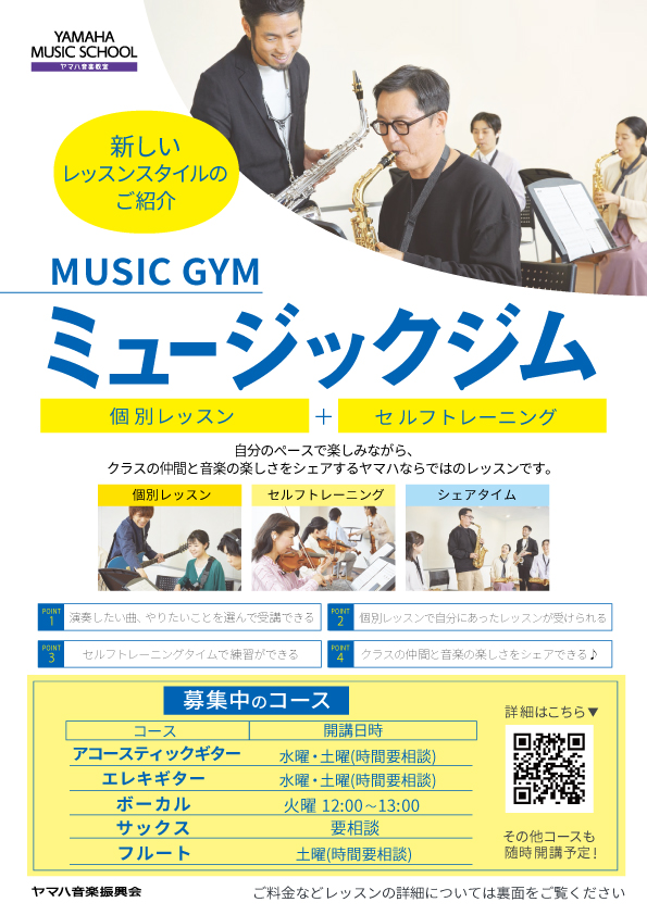 ミュージックジムは、個別レッスン・セルフトレーニング・シェアタイムを組み合わせた新しいかたちのレッスンです。