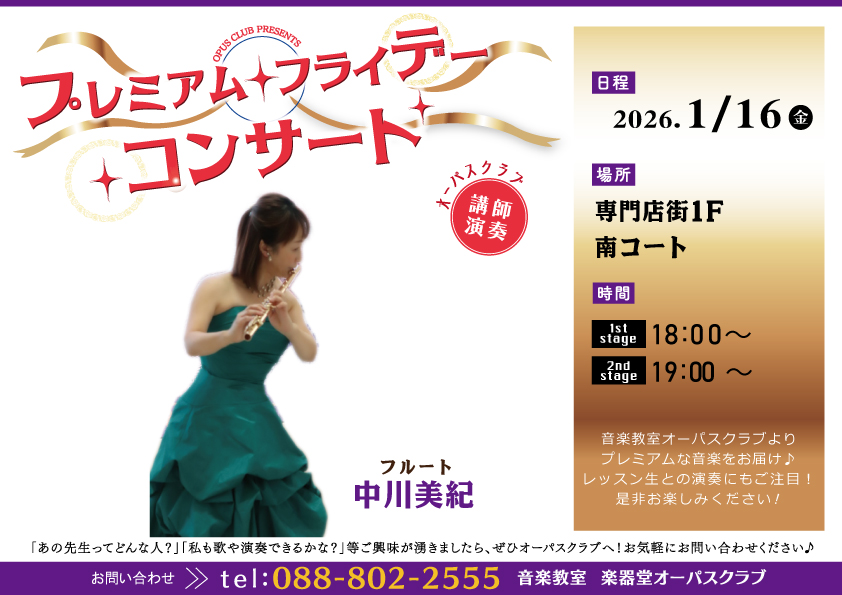 1/16(金)のプレミアムフライデーコンサートは、フルート 中川 美紀先生による演奏です♬