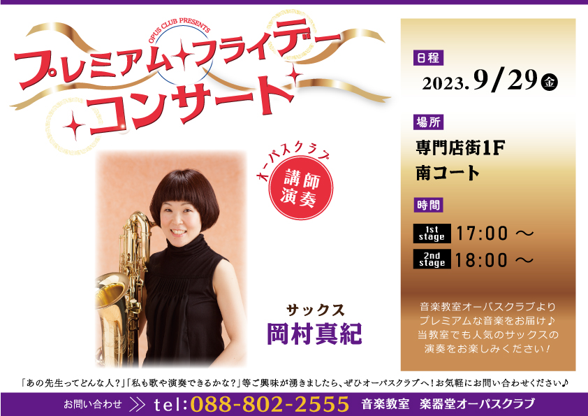 9/29(金)のプレミアムフライデーコンサートは、サックス 岡村真紀先生による演奏です♬
