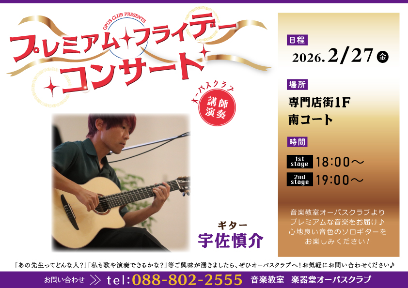 【2月イベント】プレミアムフライデーコンサート 2026年02月01日 毎月最終週の金曜日に開催しているプレミアムフライデーコンサート♩プレミアムな金曜日、心に響く音を。 ■日時:2026年2月27日(金) 1st 18:00〜 / 2nd 19:00〜■場所:イオンモール高知 専門店街1F 南コート■出演:ギター講師 宇佐慎介先生 ■観覧無料 (どなたでもご自由に観覧いただけます) 次»
