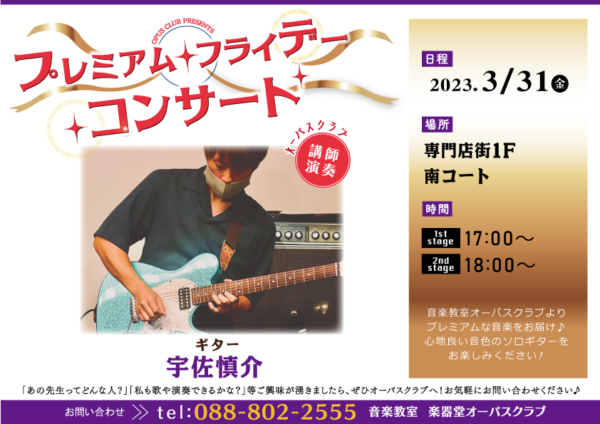 3/31(金)のプレミアムフライデーコンサートは、ギター 宇佐慎介先生による演奏です♬