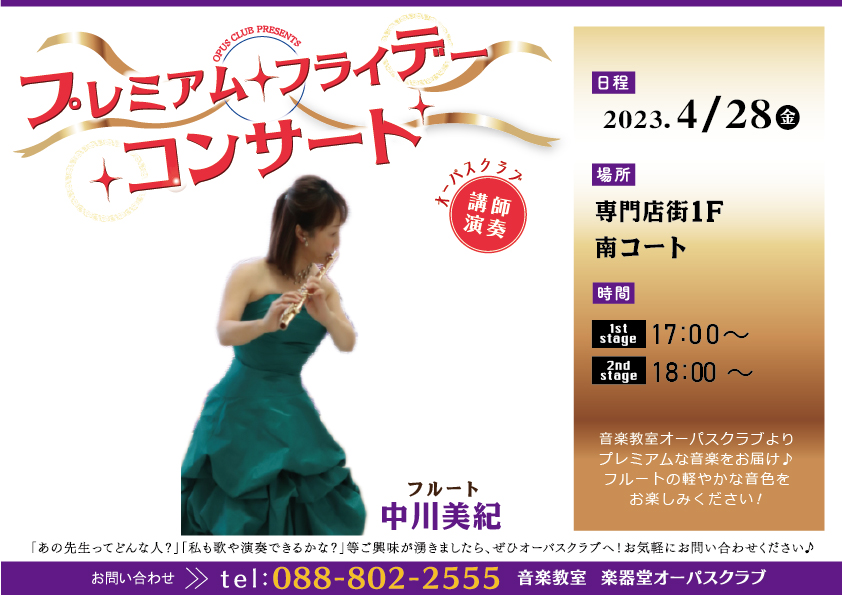 4/28(金)のプレミアムフライデーコンサートは、フルート 中川美紀先生による演奏です♬