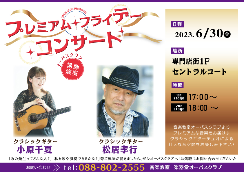 【6月イベント】プレミアムフライデーコンサート 2023年06月01日 6/30(金)のプレミアムフライデーコンサートは、クラシックギター 小原千夏先生(オーパスクラブ講師)と、松居孝行さんによる演奏です♬イオンモール高知 専門店街1F セントラルコートにて17:00〜・18:00〜の2回公演で行います。お買い物がてらに、是非お立ち寄りくださいませ。 «前 次»